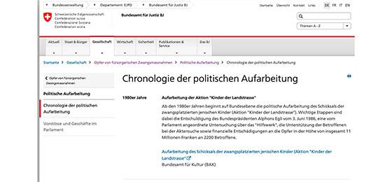 Weiter gibt es neu die Rubrik «Politische Arbeit», welche eine Chronologie zur Geschichte der Aufarbeitung in der Schweiz zur Thematik bietet. Zudem ist auch eine Übersicht über die kantonalen Zeichen der Erinnerung aufgeschaltet.